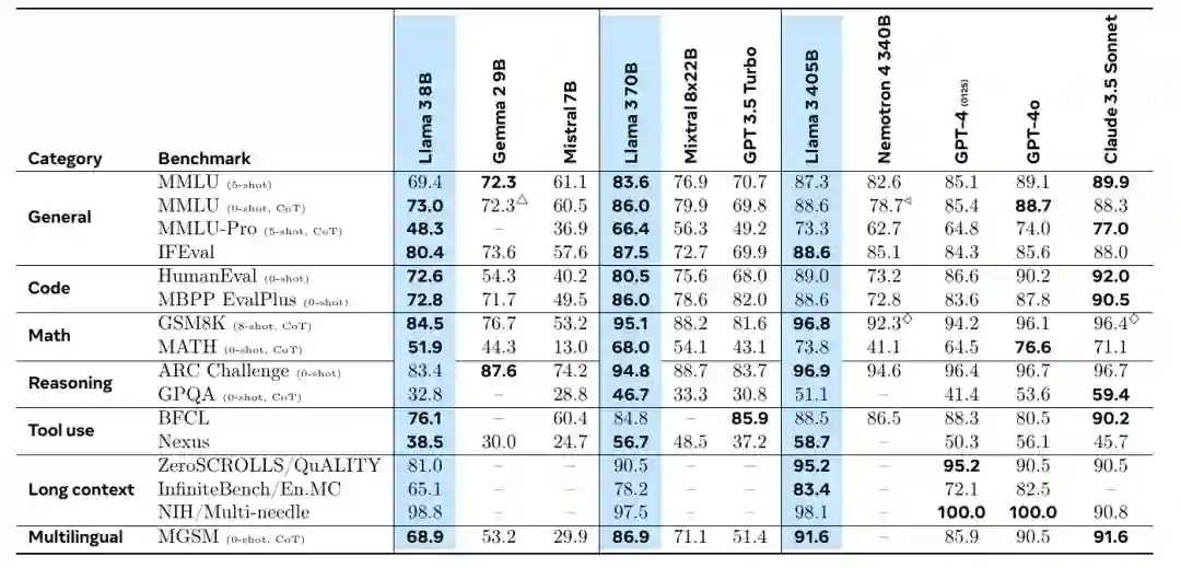 表2 在关键基准评估中微调后的Llama 3模型的性能。该表比较了8B、70B和405B版本的Llama 3与竞争模型的性能。我们在三种模型尺寸等级中,每个等级中表现最佳模型的结果用粗体表示。△表示使用5次提示(无CoT)获得的结果。◁表示未使用CoT获得的结果。ᛜ表示使用零次提示获得的结果。