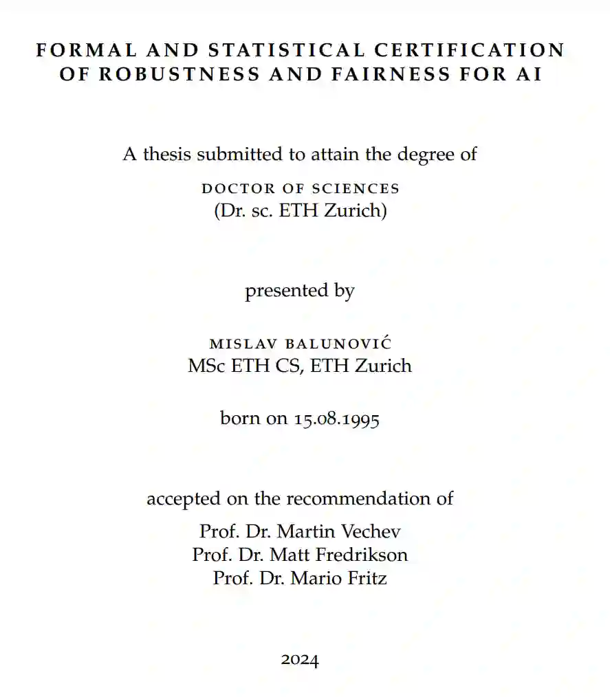 在本论文中,我们专注于安全人工智能的两个方面:鲁棒性与公平性。当机器学习模型在输入发生变化时仍能正确运行,则称其具有鲁棒性。输入的变化可以是由对抗者造成的(例如,有人故意向图像中添加噪声),也可以是在推理过程中自然发生的(例如,摄像头拍摄的图像发生位移)。解决这一问题对于开发能够在环境变化时依然有效的机器学习系统至关重要。公平性是人工智能安全的另一重要话题,随着机器学习模型通常基于偏差数据进行训练,模型本身也可能会开始表现出类似的偏差行为。尽管公平性有多种定义,本论文关注个体公平性(要求相似个体获得相似结果)和群体公平性(要求不同群体间的平均预测相似)。随着机器学习越来越多地被用于重要的社会决策中,充分解决公平性问题变得越来越重要。