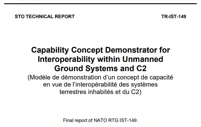 本报告描述了北约STO RTG IST-149无人地面系统和C2内互操作性能力概念演示器的研究和实验工作。无人地面车辆(UGVs)在现代战斗空间中正变得越来越重要。这些系统可以携带大量的传感器套件,从前线提供前所未有的数据流。另一方面,这些系统在大多数情况下仍然需要远程操作。重要的是要认识到,如果没有适当的方式在联盟伙伴之间交换信息和/或将其纳入C2系统,ISR数据在很大程度上将是无用的。该小组的主要目的是找到改善这种情况的方法,更具体地说,调查从操作员控制单元(OCU)控制UGV和接收数据的可能标准,并在现实世界的场景中测试它们。
