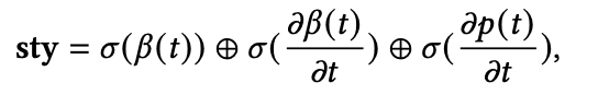 其中beta是表情,p是姿态,sigma是标准差。有了这样的sty code,接下来的问题就是怎么将style融入到audio2motion的模型中。我们尝试了很多方案,比如adain,但是方案都没有最简单的在resnet1D的中间层将隐层音频特征与sty融合效果好,因此最后采用了最简单的方案: 直接把隐层音频特征的每一帧和sty拼接,如下图所示。