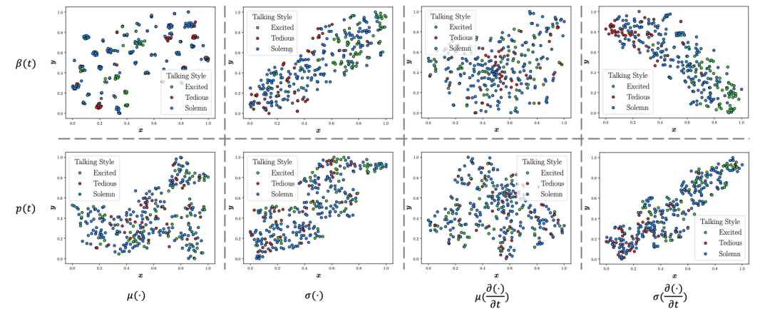 为了找到这样一个统计量,我们做了大量的statistical study,发现风格与表情序列的方差、表情序列差分的方差,姿态序列差分的方差密切相关。因此我们将控制风格的连续性统计量定义如下: