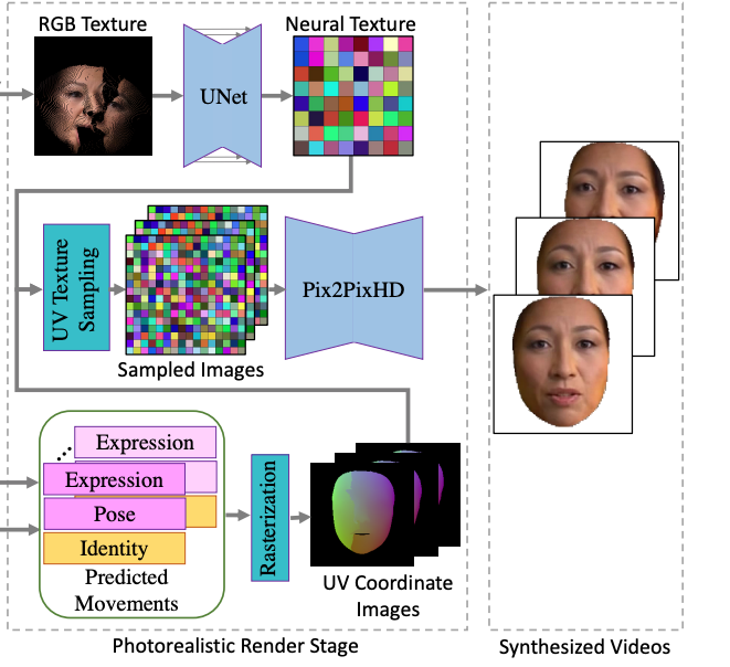 我们参考了neural voice puppetry中deferred neural render的方案,用神经纹理+UV纹理采样+图像迁移的方式做渲染。但是,deferred neural render需要2-3分钟的视频训练神经纹理,我们则训练了一个texture encoder从单张图片合成纹理。在具体实现中,我们从RGB图像以及单目的重建结果中unwrap出RGB纹理,随后用UNet从RGB纹理中合成神经纹理,再将神经纹理输入到后续神经渲染的流程中。通过这样的方式,我们在单张图像上实现了姿态、表情的控制。具体如下图: