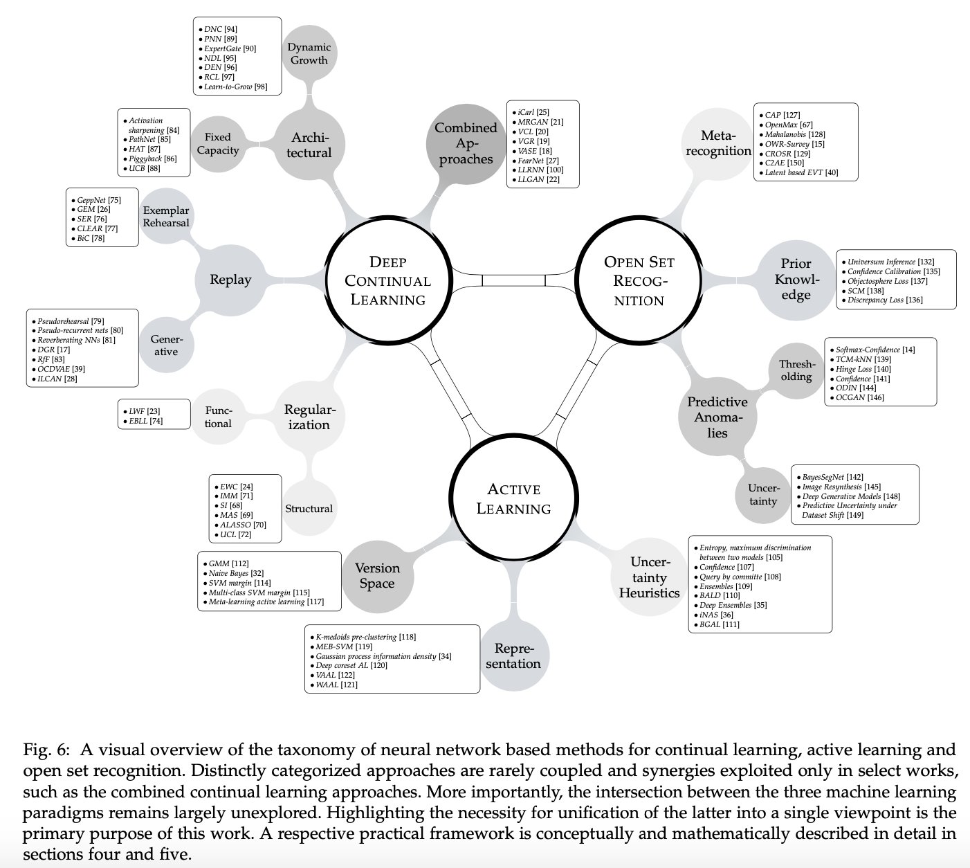 在这项工作中,我们第一次努力建立一个原则性和巩固的深度持续学习、主动学习和在开放的世界中学习的观点。我们首先单独回顾每一个主题,然后继续找出在现代深度学习中似乎较少受到关注的以前学到的教训。我们将继续争论,这些看似独立的主题不仅从另一个角度受益,而且应该结合起来看待。在这个意义上,我们建议将当前的持续学习实践扩展到一个更广泛的视角,将持续学习作为一个总括性术语,自然地包含并建立在先前的主动学习和开放集识别工作之上。本文的主要目的并不是引入新的技术或提倡一种特定的方法作为通用的解决方案,而是对最近提出的神经网络[39]和[40]中基于变分贝叶斯推理的方法进行了改进和扩展,以说明一种走向全面框架的可能选择。重要的是,它作为论证的基础,努力阐明生成建模作为深度学习系统关键组成部分的必要性。我们强调了在这篇论文中发展的观点的重要性,通过实证证明,概述了未来研究的含义和有前景的方向。
