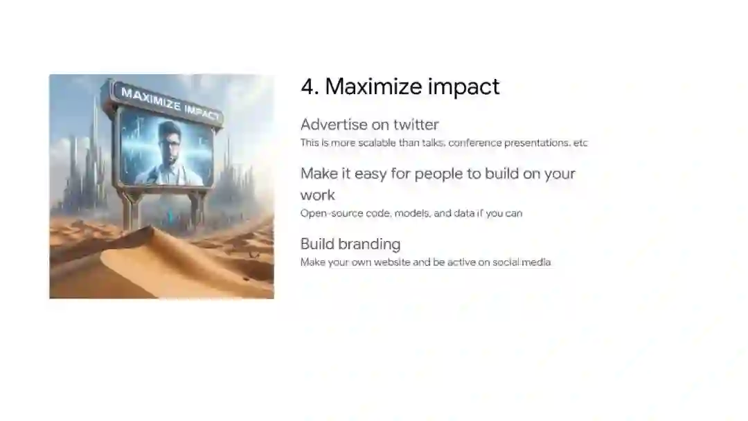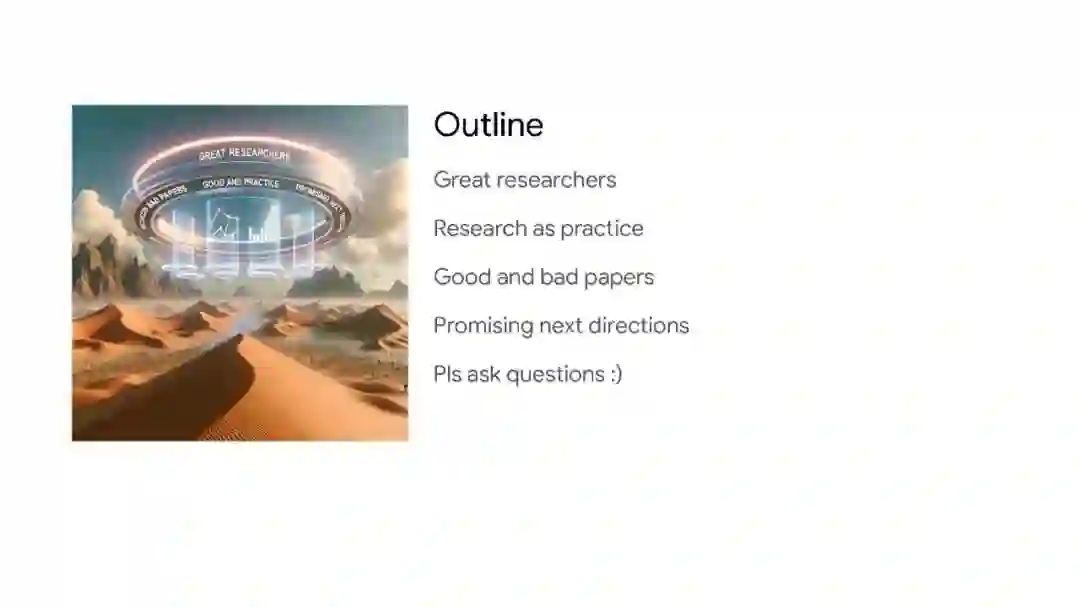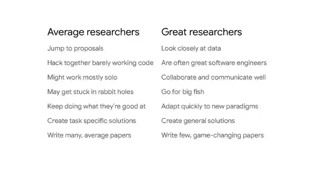 - 普通研究者可能会陷入“兔子洞”——如果他们的实验结果只是普通,他们会花3个多星期撰写并提交到会议。而杰出的研究者在知道某种方法不会取得重大突破时,会迅速转向其他研究。