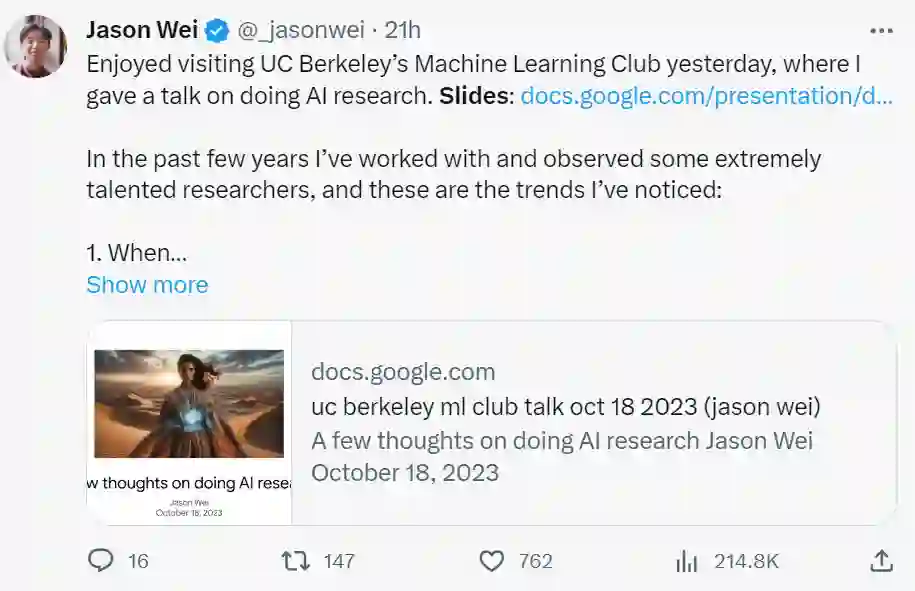 **OpenAI科学家Jason Wei。**Jason Wei毕业于达特茅斯大学,之前,他在Google Brain担任高级研究科学家,在大模型研发领域拥有丰富的经验和杰出成就,在谷歌工作期间曾主导推广了大语言模型中包括思维链提示、指令微调和模型涌现在内一系列关键思想的诞生。 过去的几年里,我与一些极为才华横溢的研究者合作并进行了观察,我注意到了以下趋势: