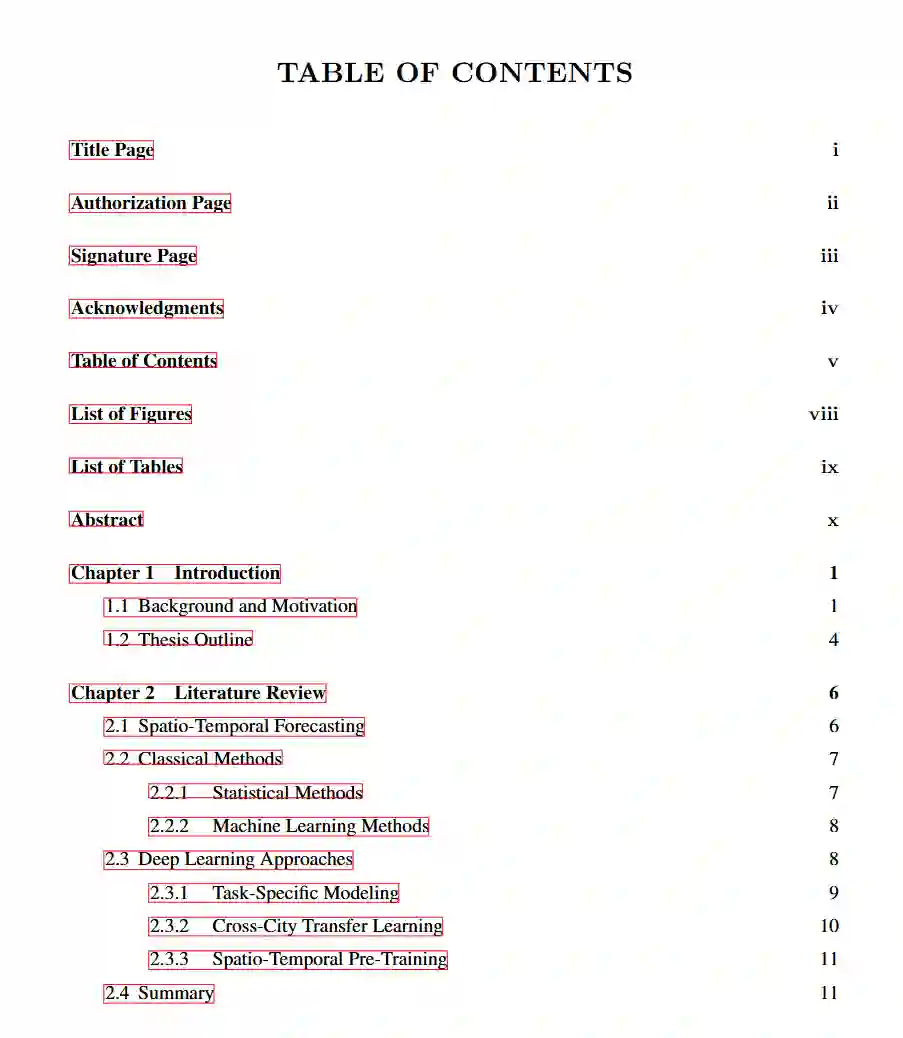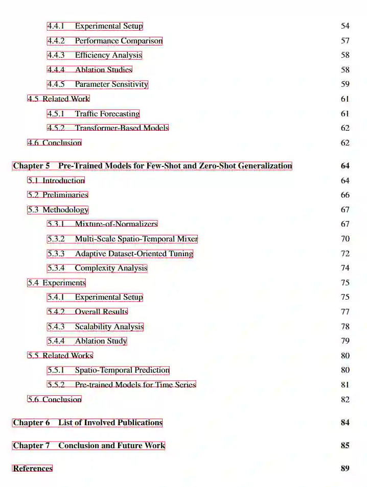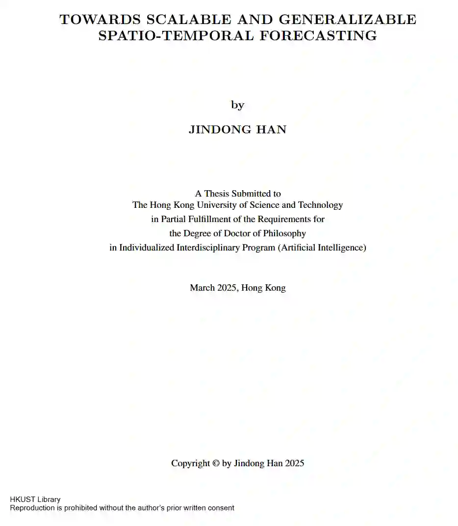 时空预测(Spatio-Temporal Forecasting, STF)在智能城市的众多应用中发挥着关键作用,例如交通管理、环境监测和资源调度。近年来,深度学习因其强大的表示能力,已成为 STF 的主流技术。然而,现有的深度 STF 模型常面临可扩展性差和泛化能力不足的问题,难以胜任现实场景中存在的部分观测、大规模数据和数据稀缺等挑战。 本论文旨在通过构建兼顾准确性、可扩展性与泛化能力的先进 STF 模型,弥合上述现实鸿沟。首先,从数据视角出发,我们将半监督 STF 问题形式化,促使模型能够从城市中已监测区域泛化至未监测区域。在此基础上,我们提出一种自监督的分层图神经网络模型,可从部分观测的时空数据中提取可迁移知识,从而有效应对半监督 STF 任务。其次,从模型结构的角度,我们设计了一种线性复杂度的时空图神经网络,高效捕捉大规模时空系统中的全局交互关系。最后,从学习目标的角度出发,我们提出一种轻量级的多域预训练方法,实现了跨域与跨区域的少样本(few-shot)与零样本(zero-shot)预测能力。 上述方法在数据稀缺场景下显著提升了 STF 模型的实用性,同时其轻量化设计也便于在资源受限的城市环境中快速部署。我们期望本论文所提出的方法能够为 STF 模型在现实世界的广泛应用和落地部署奠定基础。
