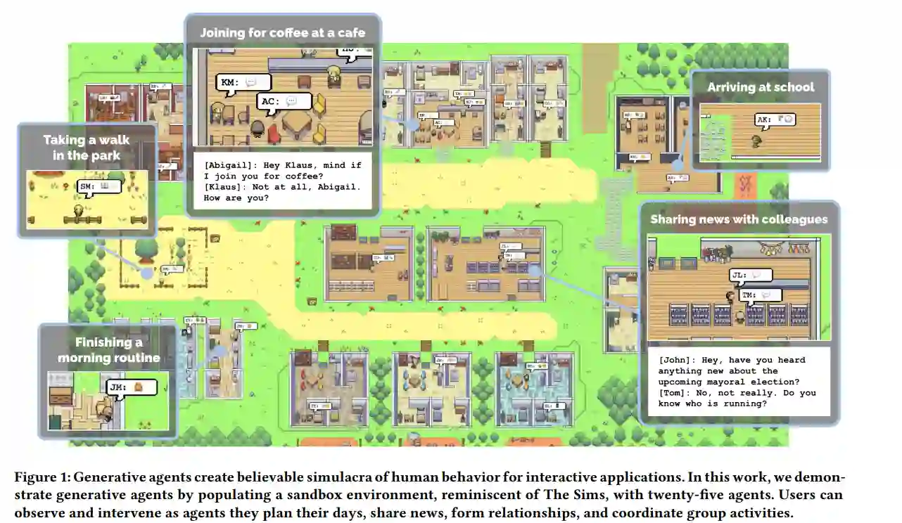 可信的人类行为代理可以增强交互应用程序的能力,从沉浸式环境到人际交流的排练空间,再到原型工具。本文提出生成智能体——模拟可信人类行为的计算软件智能体。生成智能体起床,做早餐,然后去工作;艺术家作画,作家写作;他们形成意见,注意到彼此,并发起对话;他们在计划第二天的时候会记住和反思过去的日子。为使生成式智能体成为可能,本文描述了一种架构,扩展了一个大型语言模型,以存储使用自然语言的智能体经验的完整记录,随着时间的推移将这些记忆合成为更高级别的反思,并动态检索它们以规划行为。我们实例化生成智能体,以填充受《模拟人生》启发的交互式沙盒环境,在那里,终端用户可以使用自然语言与一个由25个代理组成的小镇进行交互。在一项评估中,这些生成式智能体产生了可信的个人和突发的社会行为:例如,从一个用户指定的概念开始,即一个智能体想要举办情人节派对,智能体自动地向未来两天的派对发出邀请,结识新朋友,邀请彼此约会到派对,并协调在正确的时间一起出现在派对上。通过消融证明,智能体架构的组成部分——观察、规划和反思——都对智能体行为的可信性有至关重要的贡献。通过将大型语言模型与可计算的交互式智能体融合,本文引入了架构和交互模式,以实现可信的人类行为模拟。