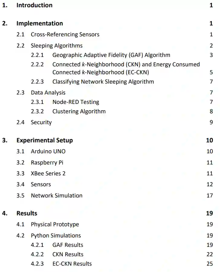 无线传感器网络的一个重要方面是网络寿命,它可以定义为最后一个节点停止工作(因故障或耗尽电力资源)所需的时间,也可以定义为网络的覆盖范围或连接性达到某个连接性阈值所需的时间。如果网络能维持更长时间的可用流量,就能减少在战场上更换或维护网络的需要,从而节省时间并降低士兵面临的风险。由于增加每个节点的电池容量成本高昂,建议采用休眠算法来延长网络的使用寿命。不主动扫描且对网络连接不重要的节点可以进入睡眠状态,以节省能量。然后,这些节点可以在稍后时间被激活,接替可用能量较少的节点的角色。在实施过程中,探索了三种不同的策略,同时测量了它们的寿命和覆盖范围。1)地理自适应保真度 (GAF) 算法、2)连接 k 邻域 (CKN) 和能耗连接 k 邻域 (EC-CKN)、3)分类网络休眠算法