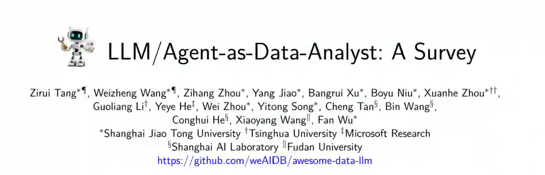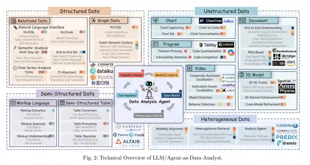 摘要—— 大语言模型(LLM)与智能体(Agent)在数据分析中的应用(即 LLM/Agent-as-Data-Analyst)已在学术界与工业界展现出显著影响。与传统的基于规则或小模型的方法相比,(具备智能体特性的)LLM 能够支持复杂数据理解、自然语言交互、语义分析功能,以及自主的数据管道编排。技术演进进一步提炼出智能数据分析智能体的五大关键设计目标,即语义感知设计、模态融合集成、自主管道、工具增强工作流,以及开放世界任务支持。从模态视角来看,我们回顾了基于 LLM 的技术在以下方面的应用:(i)结构化数据(如关系数据的表格问答与图数据的 NL2GQL),(ii)半结构化数据(如标记语言理解与半结构化表格建模),(iii)非结构化数据(如图表理解、文档理解、编程语言漏洞检测),以及(iv)异构数据(如数据湖的数据检索与模态对齐)。最后,我们总结了尚存的挑战,并提出若干见解与实践方向,以推动基于 LLM/智能体的数据分析发展。 关键词—— LLM,智能体,数据分析,结构化数据,半结构化数据,非结构化数据,异构数据