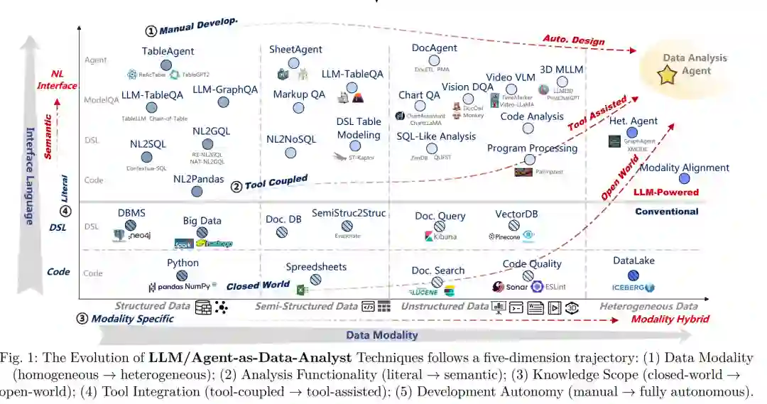如图 1 所示,LLM 赋能的数据分析智能体可沿五个关键维度概括,每一维对应通用数据分析智能体的设计目标: * 从字面到语义。 早期更多是生成可执行代码或 DSL 来辅助分析;现在正转向基于语义理解直接产出分析结果,减少中间过程。 * 从单一模态到模态融合。 由仅支持单模态转向可在多模态之间进行协同分析的模态混合能力。 * 从人工开发到自主设计。 由人工分解工作流(任务拆解、代码生成、操作执行)转向更广泛的自主工作流设计,降低人为介入。 * 从工具耦合到工具辅助。 由紧耦合、框架特定的工具体系,转向可调用任意工具集的解耦架构,提升灵活性与适应性。 * 从封闭世界到开放世界。 由面向特定领域任务的定制智能体,演进到可分析多样真实世界数据(文档、视频等)的通用型智能体,降低用户门槛。