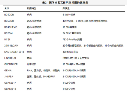 医学命名实体识别较常用的数据集主要有以下几种,见表2。