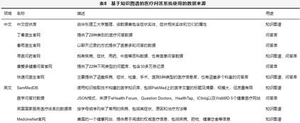 (1)实现方法 本文参考了近3年的研究进展,总结出医疗领域基于知识图谱的问答系统主要有两种实现方法:检索式和生成式。其中,检索式主要面向系统构建的知识图谱,生成式主要面向系统收集的问答库数据,表8列出了可用于构建基于知识图谱的医疗问答系统的数据来源。