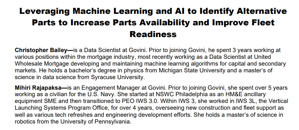 美国工业基地保持作战可用性(Ao)的速度和灵活性是战备状态的基础。然而,零部件短缺等过时问题困扰着武器系统,对可用性造成了负面影响。利用人工智能和机器学习(AI/ML)流程来快速识别潜在的替代零件,可以大大加快识别替代零件所需的时间。