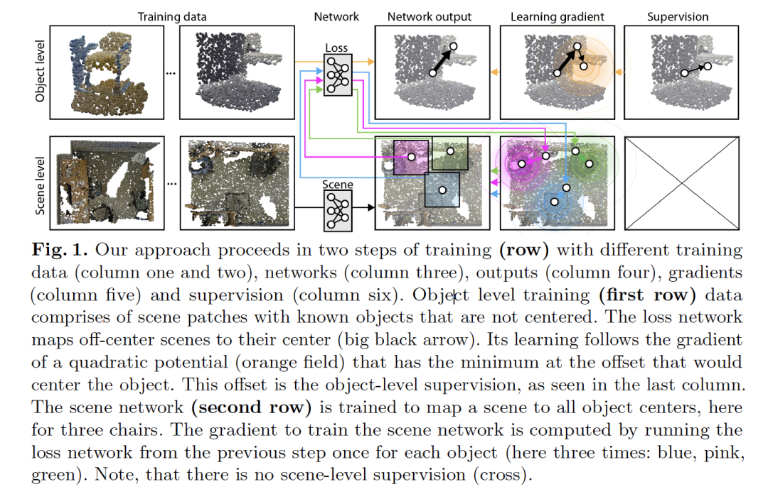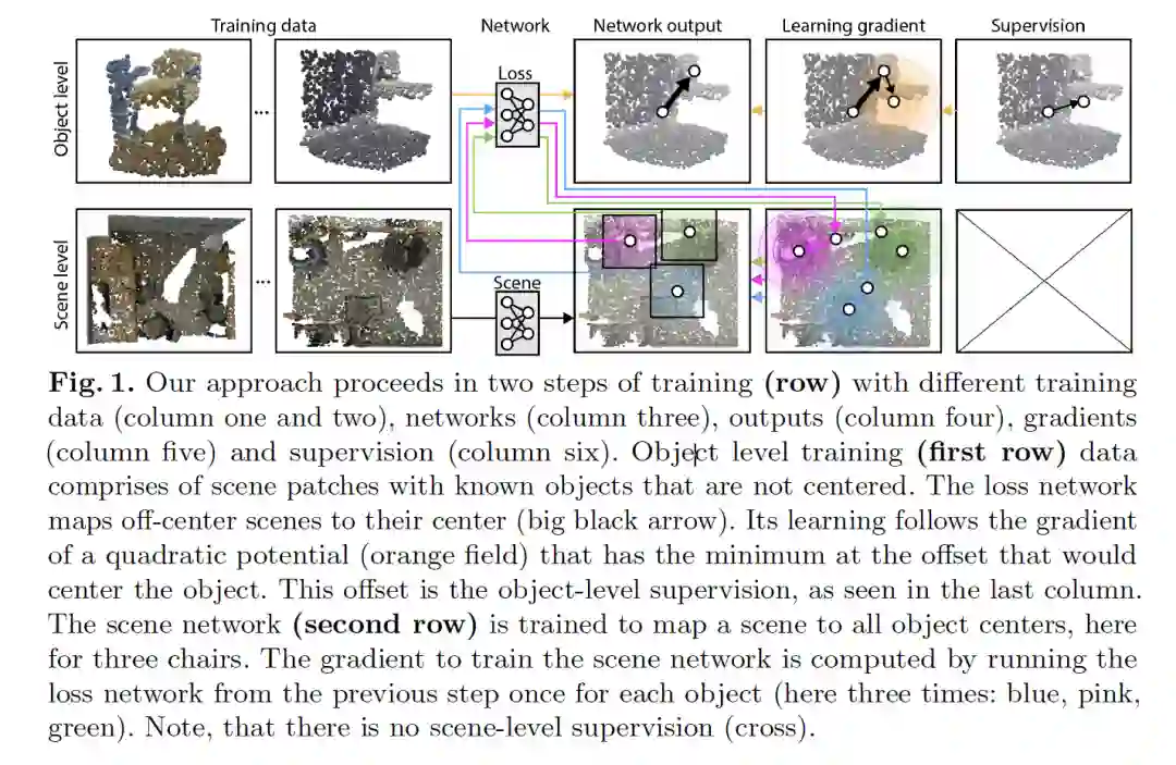 摘要:对于2D图像,海量语义标注很容易实现,但对于3D场景,实现起来要困难得多。像ShapeNet这样的3D存储库中的目标是有标签的,但遗憾的是,这些目标只是孤立的,并没有上下文。3D场景可以通过 city-level 的距离扫描仪获取,但很少带有语义标签。为了解决这一差异,我们引入了一种新的优化程序,它允许使用原始3D扫描进行3D检测训练,同时在只使用5%的目标标签的情况下仍然可以获得相当的性能。我们的优化使用两个网络。场景网络将整个3D场景映射到一组3D目标中心。由于我们假设场景不是由中心标记的,所以没有经典的损失(如:chamfer)可以用来训练它。取而代之的是,我们使用另一个网络来模拟损失。该损失网络在一个小的带标签的子集上进行训练,并且在存在干扰的情况下将非居中的3D目标映射到其自身的中心。该函数非常类似监督损失具有的梯度,因此可以作为损失来替代。我们的评估文档分别在较低级别的监督下达到具有竞争力的准确性,在可比的监督下具有高质量。