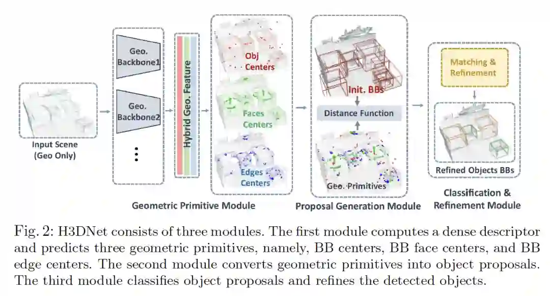 摘要:我们引入了H3DNet,它以一个三维点云作为输入,输出一组面向目标的边界框(BB)集合及其语义标签。H3DNet的关键思想是预测一组混合的几何图元(geometric primitives),即BB中心、BB面中心和BB边中心。通过定义目标与几何图元之间的距离函数,我们展示了如何将预测的几何图元转换为目标候选。此距离函数可实现对目标候选的连续优化,其局部最小值可提供高保真目标候选。然后,H3DNet利用匹配和优化模块将目标候选分类为检测到的目标,并微调检测到的目标的几何参数。与使用单一类型的几何图元相比,混合几何图元集不仅为目标检测提供了更准确的信号,而且它还在所得到的3D布局上提供了过完整的约束集。因此,H3DNet可以容忍预测的几何图元中的异常值。我们的模型在两个具有真实3D扫描的大型数据集ScanNet和SUN RGB-D上实现了最新的3D检测结果。