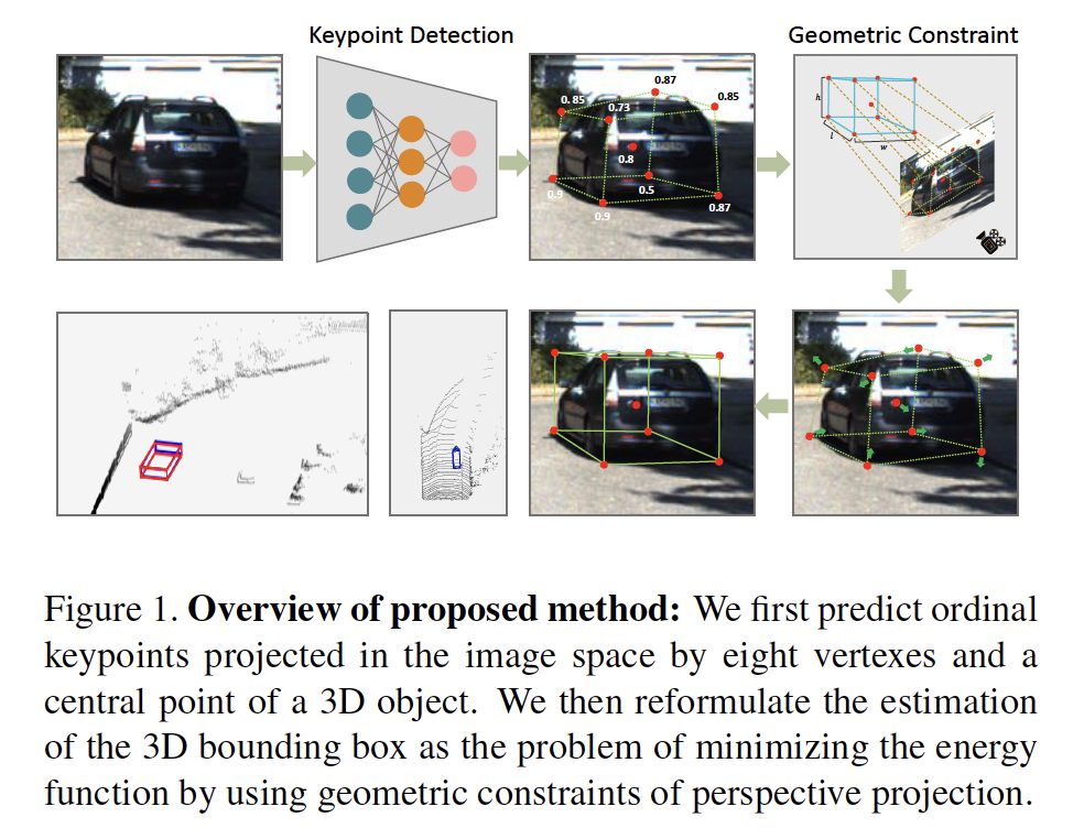 摘要:在这项工作中,我们提出了一种高效、准确的单目3D检测框架。大多数成功的3D检测器都将3D bounding box 到2D bounding box的投影约束作为一个重要组成部分。2D 框的四个边仅提供四个约束,并且随着2D检测器的小误差,检测性能会急剧恶化。与这些方法不同的是,我们的方法预测图像空间中3D bounding box 的九个透视关键点,然后利用3D和2D透视的几何关系来恢复3D空间中的维度、位置和方向。这种方法即使在关键点的估计非常嘈杂的情况下,也可以稳定地预测目标的属性,这使我们能够以较小的架构获得较快的检测速度。我们的方法的训练仅使用目标的3D属性,而无需外部网络或监督数据。我们的方法是第一个单目图像3D检测的实时系统,同时在KITTI基准上实现了最先进的性能。