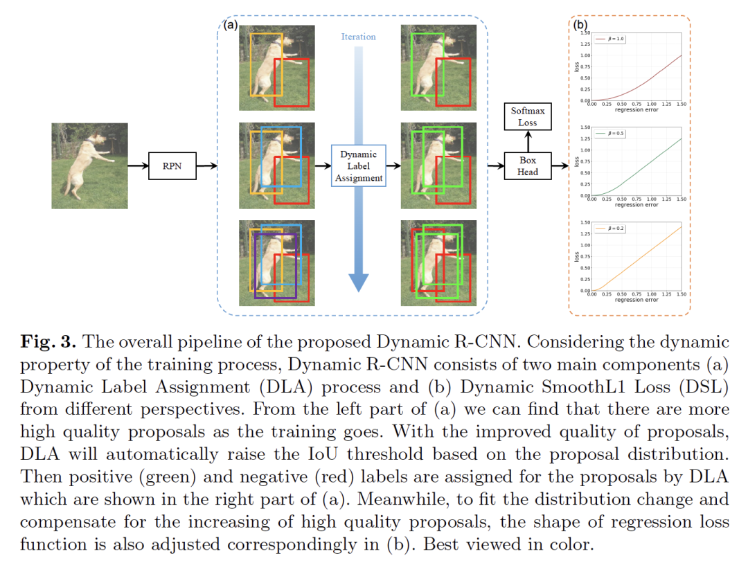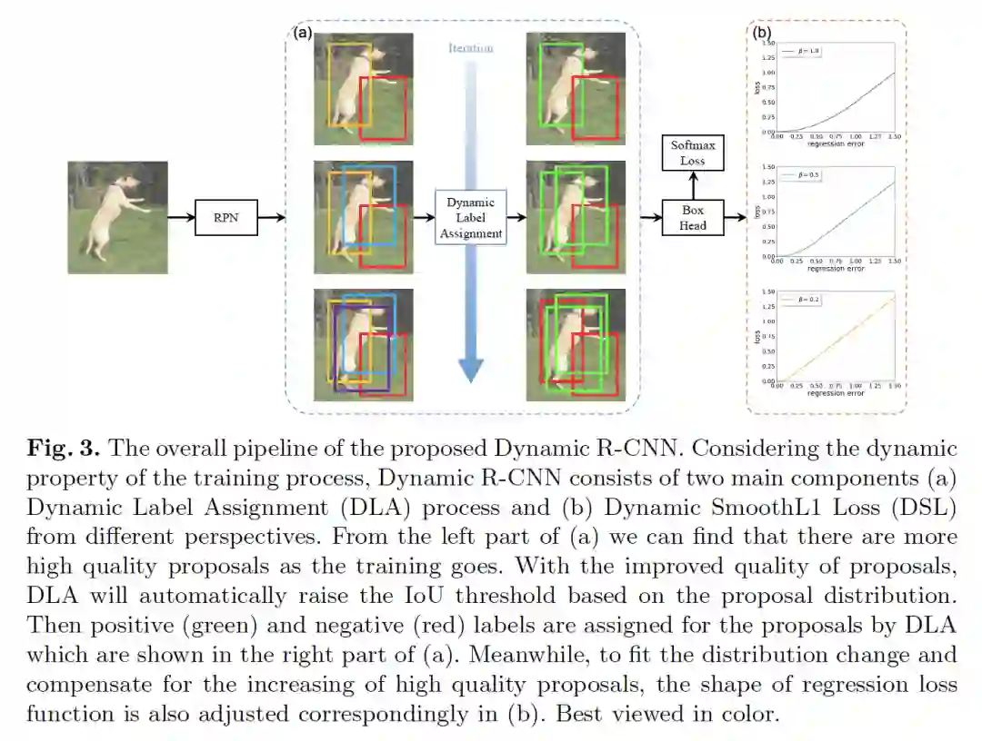 摘要:虽然two-stage目标检测器近年来不断提升了最先进的性能,但训练过程本身还有很多提升的空间。在这项工作中,我们首先指出了固定网络设置和动态训练过程之间的不一致问题,这对性能有很大的影响。例如,固定标签分配策略和回归损失函数不能适应候选区域(Proposal)的分布变化,不利于训练高质量的检测器。因此,我们提出了动态R-CNN算法,在训练过程中根据候选的统计信息自动调整标签分配标准(IOU阈值)和回归损失函数的形状(SmoothL1损失的参数)。这种动态设计更好地利用了训练样本,并推动检测器拟合更多的高质量样本。具体地说,我们的方法在MS Coco数据集上比ResNet-50-FPN基线在AP上提升了1.9%在AP_{90}上提升了5.5%,并且没有额外的开销。