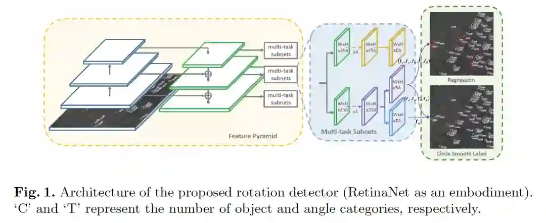 摘要:近年来,面向任意方向的目标检测(Arbitrary-oriented object detection)由于其在航空图像、场景文字、人脸等领域的重要作用,在视觉领域引起了越来越多的关注。本文指出,由于角度周期性或角度的顺序问题,现有的基于回归的旋转检测器存在边界不连续的问题。通过仔细的研究,我们发现根本原因是理想的预测超出了定义的范围。我们设计了一种新的旋转检测基线,通过将角度预测从回归问题转化为精度损失很小的分类任务来解决边界问题,从而与以往使用粗粒度进行旋转检测的工作不同,我们设计了一个高精度的角度分类。我们还提出了一种环形平滑标签(CSL)技术来处理角度的周期性,并提高了对相邻角度的容错性。在此基础上,我们进一步介绍了CSL中的四种窗函数,并探讨了不同窗半径大小对检测性能的影响。在DOTA、HRSC2016这两个大规模航空图像公共数据集以及场景文字数据集ICDAR2015和MLT上的大量实验和可视化分析表明了该方法的有效性。