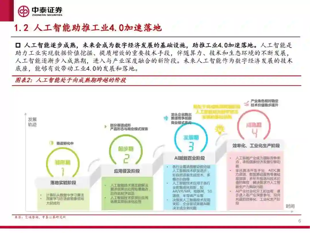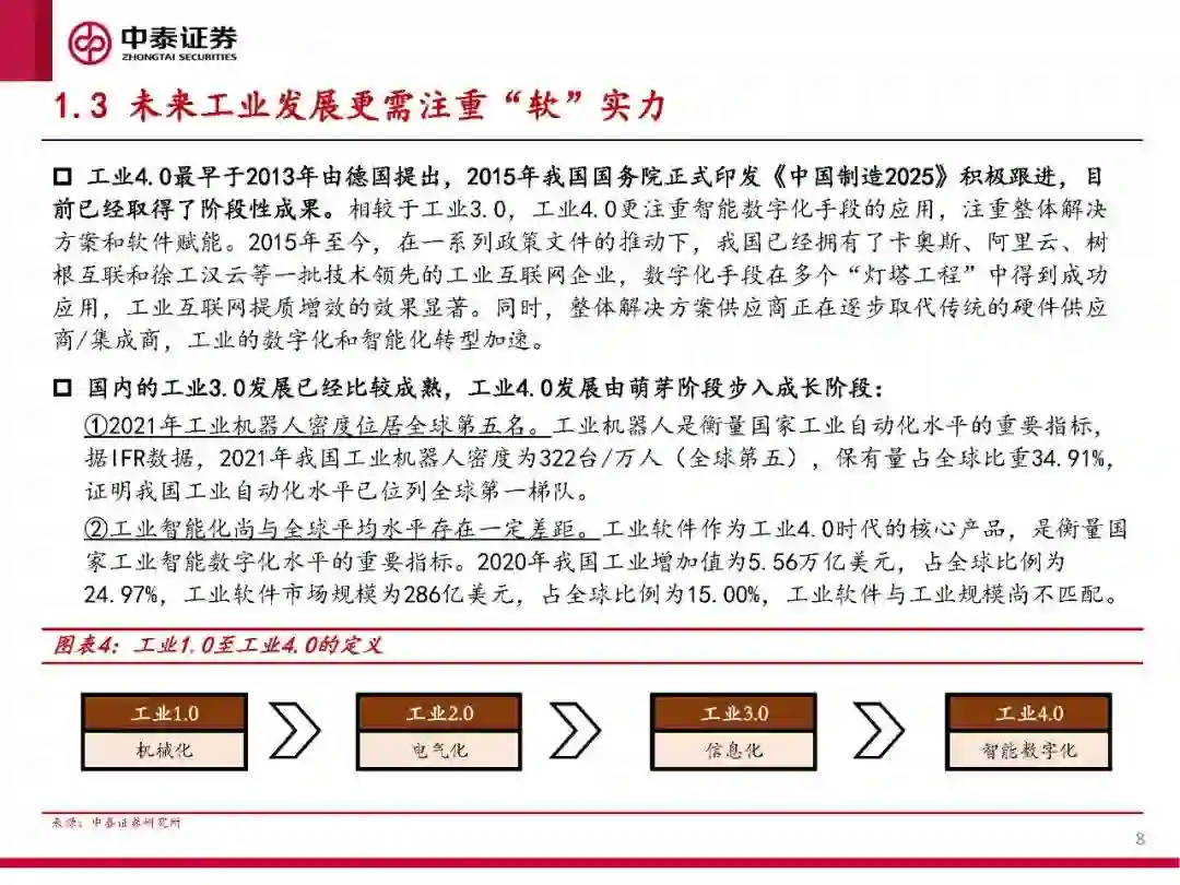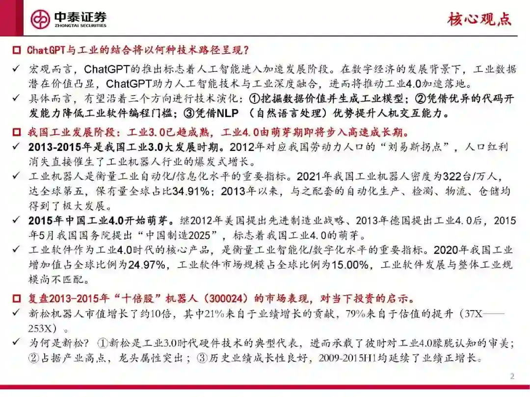 宏观而言,ChatGPT的推出标志着人工智能进入加速发展阶段。在数字经济的发展背景下,工业数据潜在价值凸显,ChatGPT助力人工智能技术与工业深度融合,进而将推动工业4.0加速落地。 具体而言,有望沿着三个方向进行技术演化:①挖掘数据价值并生成工业模型;②凭借优异的代码开发能力降低工业软件编程门槛;③凭借NLP(自然语言处理)优势提升人机交互能力。 我国工业发展阶段:工业3.0已趋成熟,工业4.0由萌芽期即将步入高速成长期。 2013-2015年是我国工业3.0大发展时期。2012年对应我国劳动力人口的“刘易斯拐点”,人口红利消失直接催生了工业机器人行业的爆发式增长。 工业机器人是衡量工业自动化/信息化水平的重要指标。2021年我国工业机器人密度为322台/万人,达全球第五,保有量全球占比34.91%;2013年以来,与之配套的自动化生产、检测、物流、仓储均得到了极大发展。 2015年中国工业4.0开始萌芽。继2012年美国提出先进制造业战略、2013年德国提出工业4.0后,2015年5月我国国务院提出“中国制造2025”,标志着我国工业4.0的萌芽。 工业软件作为工业4.0时代的核心产品,是衡量工业智能化/数字化水平的重要指标。2020年我国工业增加值占全球比例为24.97%,工业软件市场规模占全球比例为15.00%,工业软件发展与整体工业规模尚不匹配。 复盘2013-2015年“十倍股”机器人(300024)的市场表现,对当下投资的启示。 新松机器人市值增长了约10倍,其中21%来自于业绩增长的贡献,79%来自于估值的提升(37X——253X)。 为何是新松?①新松是工业3.0时代硬件技术的典型代表,进而承载了彼时对工业4.0朦胧认知的审美;②占据产业高点,龙头属性突出;③历史业绩成长性良好,2009-2015H1均延续了业绩正增长。 结论:建议从技术属性、龙头地位、业绩成长三方面选择赛道和个股。 技术属性:ChatGPT与工业结合的三大技术演化方向,就是可选赛道的技术特征点,这决定了β属性。 竞争格局:龙头公司优秀的竞争格局和头部效应,是α逻辑兑现的保障。 业绩成长性:业绩成长确定性将提供安全边际。 受益标的:景嘉微、中控技术、川仪股份、亿嘉和、景业智能、迈赫股份、埃斯顿等。 工业软件:工业软件能力成为衡量工业4.0时代企业核心竞争力的重要指标,未来高端工业软件的研发和突破是我国迈向工业4.0的必经之路。 服务机器人:2022年服务机器人占比首超工业机器人,GPT等人工智能技术将为服务机器人的交互带来质变,服务机器人行业将迎拐点。 特种机器人:GPT类技术将使特种机器人拥有更高的自主性和适应性,以及更优秀的协作能力,行业有望持续高增。 工业机器人:近年我国政府及相关部门出台了一系列政策,鼓励工业机器人产业发展,5G、云计算、AI等技术变革将助推工业机器人加速实现国产化、智能化、高端化。 基于机器人平台的工业旅游项目:我国工业旅游具有广阔发展空间,ChatGPT助力实现自然的人机交互,增强工业旅游体验,引领行业新未来。 GPU:GPU是人工智能发展过程中的算力底座,在ChatGPT等NLP语言模型升级过程中,GPU行业也将迎来历史性的上升通道。 传感器:工业4.0转型过程中,传感器是感知层核心设备,进口替代需求迫切,GPT类技术为高端工业传感器带来新机遇。