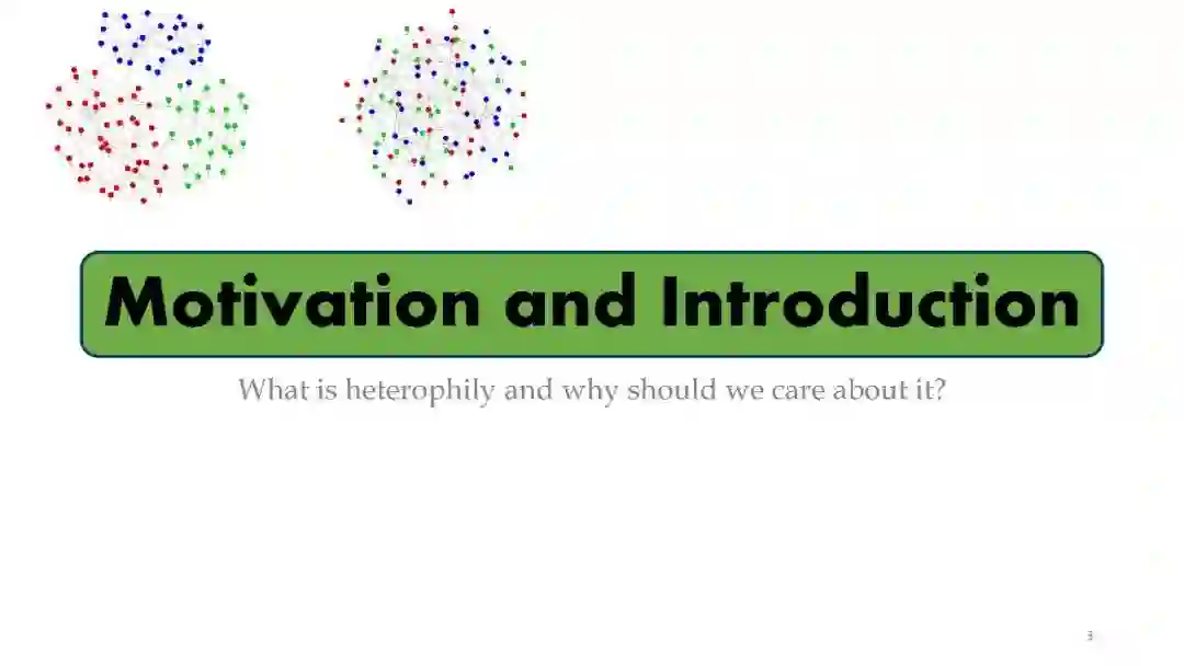 在本教程中,我们将系统地总结最新的异质性图学习进展,并以易于理解的方式呈现给读者。内容包括:(1)基准数据集的分类及在合成图上的同质性度量评估;(2)最新监督与无监督学习方法的细致分类;(3)同质性/异质性的理论分析;(4)与异质性相关的应用;(5)异质性图学习的挑战与未来方向。