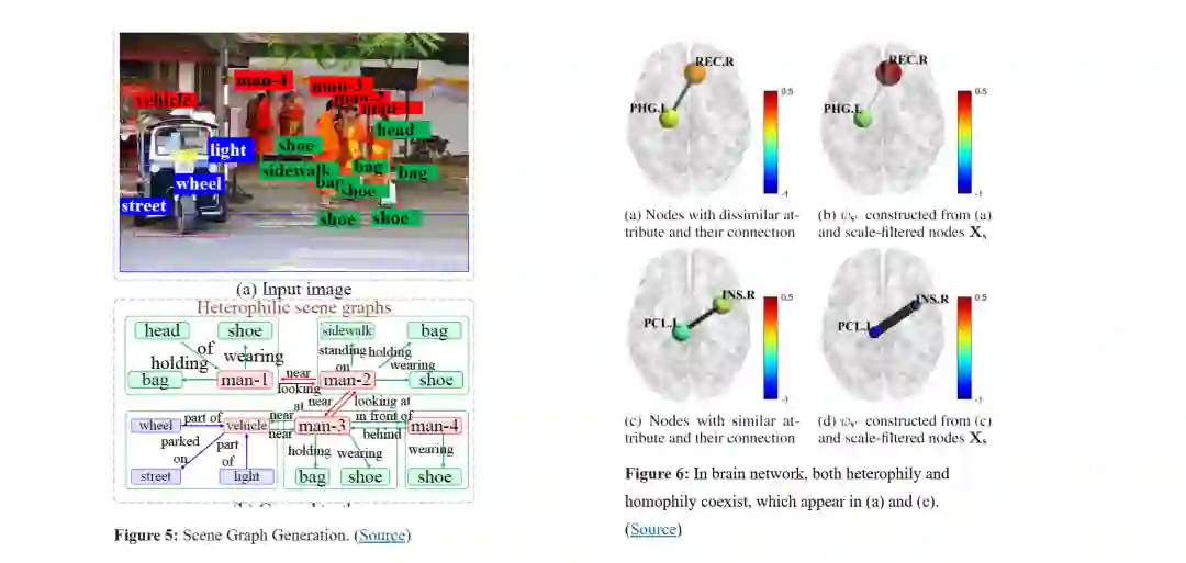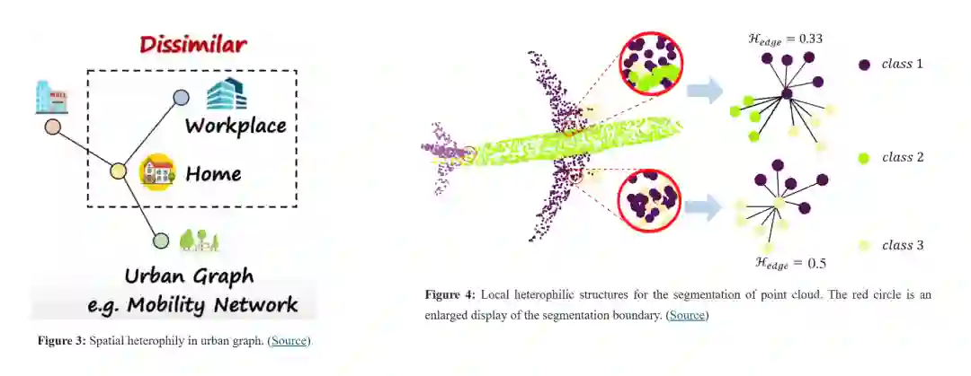 另一方面,缺乏同质性,即异质性(Heterophily),被认为是GNN在异质图(heterophilic graphs)上表现较差的主要原因,这种性能退化现象在广泛的应用场景中都有出现。人们重新审视并评估了许多现有的图模型,包括图转换器(graph transformer)及其变种,特别是在各种异质图场景中的表现,例如异构图、时序图和超图等。此外,异质性问题广泛涉及许多与图相关的应用(如图1-6所示),例如图欺诈/异常检测、点云分割、城市计算、推荐系统、场景图生成、药物发现、大脑网络分析、链路预测、隐私保护、图对抗攻击与鲁棒性等。近年来,针对异质性问题,已经投入了大量的研究和努力。