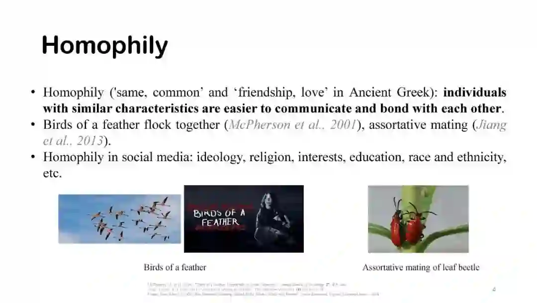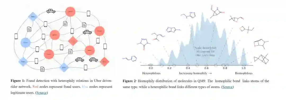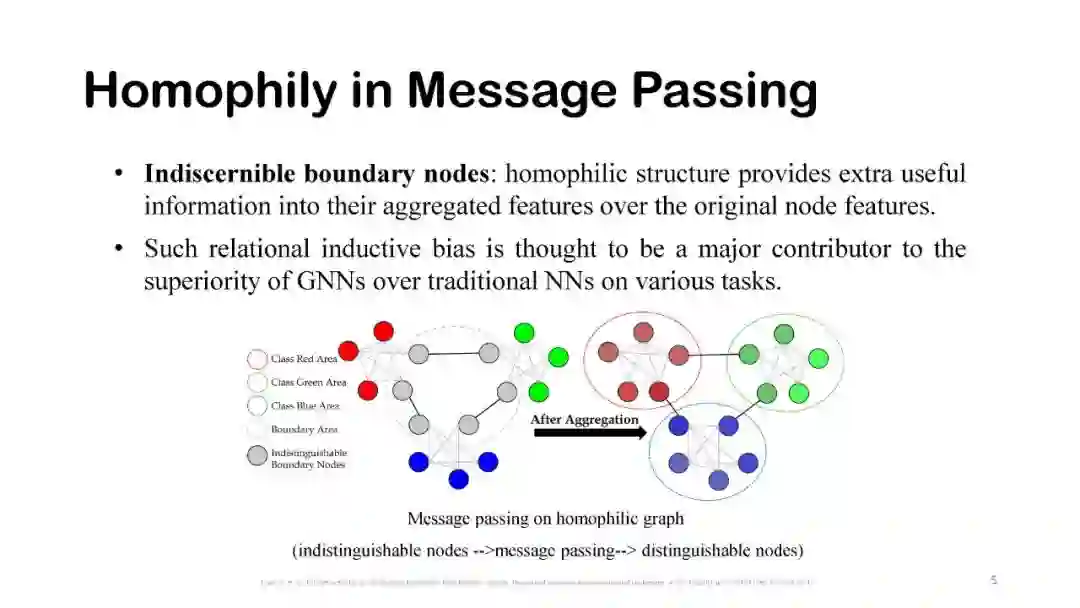 图模型,特别是在节点级任务中的成功,通常被认为源于同质性原则。同质性(Homophily)是社会学和进化生物学中的一个概念,指的是具有相似特征的个体更容易进行交流和建立联系。在图表示学习中,它描述了节点具有相同标签或相似属性的网络,这些节点更可能相互连接。这样的关系归纳偏差被认为是图神经网络(GNNs)在各类任务中优于传统神经网络(NNs)的主要原因之一。