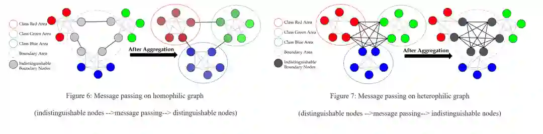 示例 如图6所示,对于不可区分的边界节点,同质性结构通过对原始节点特征进行聚合,提供了额外的有用信息。这种关系归纳偏差被认为是图神经网络(GNNs)在各类任务中优于传统神经网络(NNs)的主要原因之一。另一方面,如图7所示,边界节点拥有更多的异质性邻居,而非同质性邻居。由于异质性边缘连接的是不同类别的节点,它们可能导致节点嵌入的混合和不可区分,从而使得图神经网络的分类任务变得更加困难。
