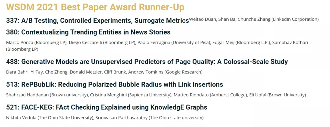 2021年第14届国际网络搜索与数据挖掘会议WSDM将在2021年3月8日到12日于线上举行。今年此次会议共收到了603份有效投稿,最终录取篇数为112篇,录取率为18.6%。近日大会公布了优秀论文奖项(WSDM 2021 Best Paper Award Runner-Up),共有5篇论文。