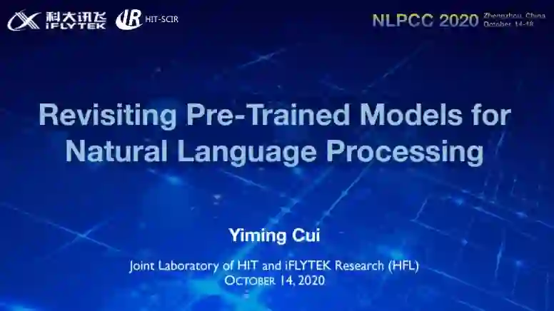 哈工大讯飞联合实验室(HFL)资深级研究员、研究主管崔一鸣受邀在NLPCC 2020会议做题为《Revisiting Pre-trained Models for Natural Language Processing》的讲习班报告(Tutorial),介绍了预训练语言模型的发展历程以及近期的研究热点。本期推送文末提供了报告的下载方式。