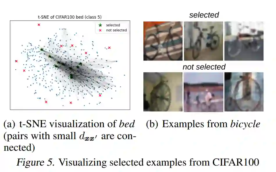 图5(a)使用t-SNE可视化了在CIFAR100中从“bed”类别中由CL-Core选择和未选择的样例。与选择和未选择样例之间的预期数据增强距离较小的样例之间有连接线。我们可以看到,被选择的样例与该类别中的许多其他样例之间的预期数据增强距离很小。图5(b)展示了从“bicycle”类别中选择和未选择的一些样例。我们可以看到,被选择的样例代表了整个类别,而未被选择的用哪个例则呈现了不常见的姿势或视角。易样本是最重要的接下来,我们使用遗忘分数(Toneva等人,2019),即在监督学习期间被正确分类后被错误分类的次数,来量化一个样例的难度。图4(e)显示了那些在监督学习中可以安全丢弃的最不易遗忘的样例(Toneva等人,2019)能够显著优于随机基线,并且在较小的子集上实现可比较的性能。附录A的图6显示了由CL-Core找到的子集具有较低的遗忘分数和较高的置信度,平均而言,它们对于监督学习来说是易样本。实际上,对于SSL来说最重要的子集对于监督学习来说却是最不重要的。困难样例损害对比学习最后,图4(f)确认了由CL-Core排名最低的样例,即由具有与其潜在类别的其他样例之间较大预期数据增强距离的样例组成的子集,会严重阻碍对比学习。这些样例很难学习,并且对于监督学习非常有益(Toneva等人,2019)。