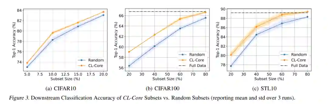 在本节中,我们首先评估对比学习训练的模型在由CL-Core和随机子集找到的常见图像分类基准数据集(即CIFAR10、CIFAR100和STL10)上的下游泛化性能。然后,我们对近似潜在类别和用于估计预期数据增强距离的代理模型的效果进行了广泛的消融研究。最后,我们研究了在子集中用于监督学习的样本的难度。