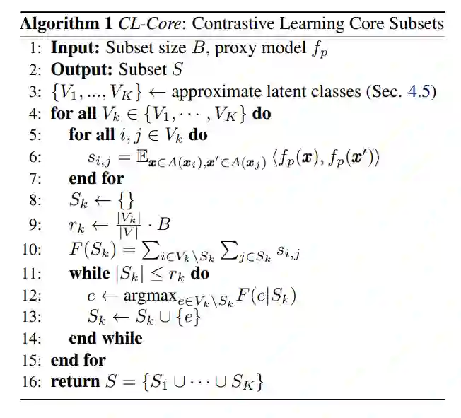 对比式自监督学习通过学习一个编码器f,最大化同一样例不同增强视图(即正对)的表示之间的一致性,并最小化不同样例的增强视图(即负对)的表示之间的一致性,从而学习训练数据中样例的表示。我们的目标是找到一个最多包含r个训练样例的子集S ⊆ V,使得通过在子集上最小化对比损失得到的编码器