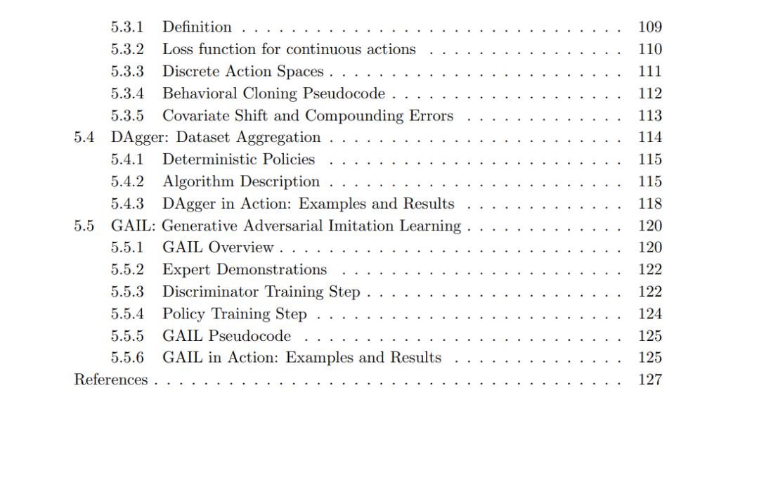 本文件旨在向读者介绍应用于具身智能体的深度强化学习(DRL)与深度模仿学习(DIL)。文档首先介绍马尔可夫决策过程(MDP)的形式化框架,并描述精确与近似的求解方法。在近似方法中,本文件将介绍经典算法 REINFORCE [21],并重点讨论近端策略优化(Proximal Policy Optimization, PPO)[19],这是当前最广泛使用且在控制具身智能体方面非常有效的强化学习算法之一。 随后,文档将过渡到深度模仿学习,介绍三类基础方法:(a)行为克隆(Behavioral Cloning)[14, 1];(b)其交互式扩展数据集聚合(Dataset Aggregation, DAgger)[15];(c)生成对抗模仿学习(Generative Adversarial Imitation Learning, GAIL)[6]。