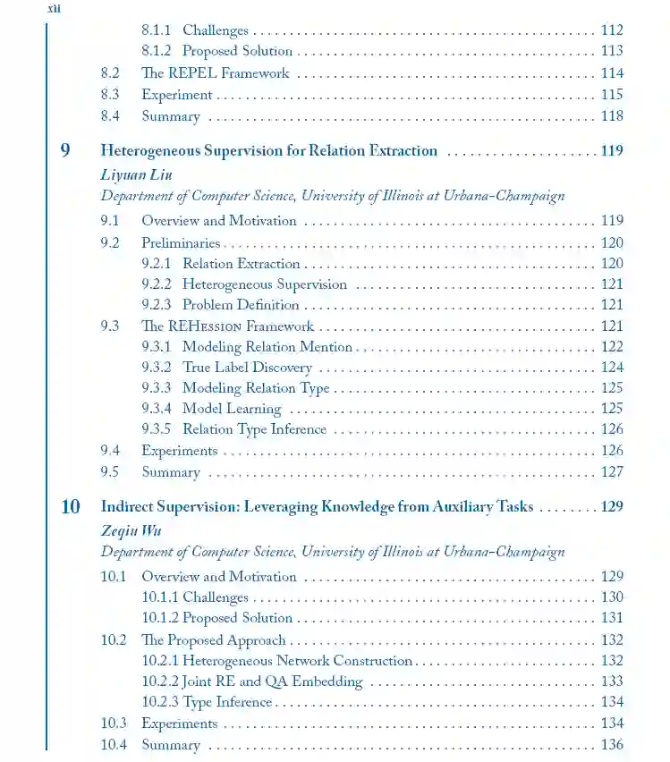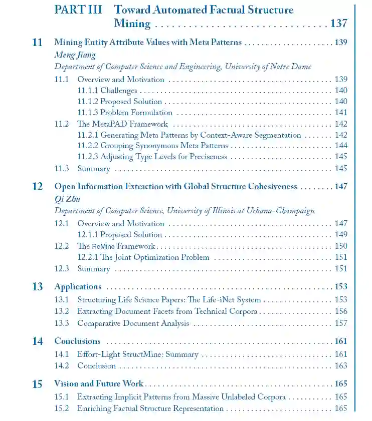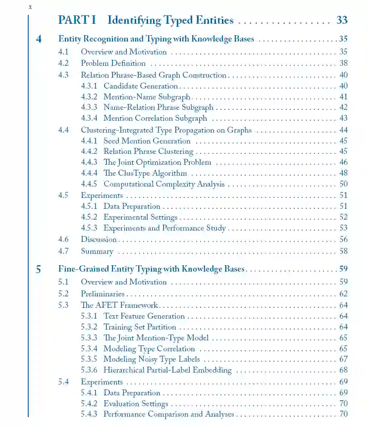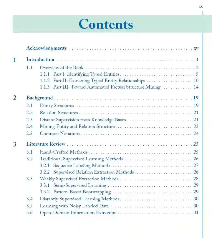 现实世界的数据虽然庞大,但在很大程度上是非结构化的,以自然语言文本的形式存在。从大量的文本数据中挖掘结构,而不需要大量的人工注释和标记,这是一个挑战,但也是非常理想的。在这本书中,我们研究了从大量非结构化文本语料库中挖掘事实知识结构(例如,实体及其关系)的原则和方法。与许多现有的结构提取方法不同,现有的方法严重依赖于人工注释数据进行模型训练,我们的轻工作量方法利用存储在外部知识库中的人工管理事实作为远程监督,并利用大型文本语料库中的丰富数据冗余进行上下文理解。这种轻工作量挖掘方法为构建文本语料库带来了一系列新的原则和强大的方法,包括:(1)实体识别、打字和同义词发现;(2)实体关系抽取;(3)开放域属性值挖掘与信息提取。本书介绍了这一新的研究前沿,并指出了一些有前景的研究方向。