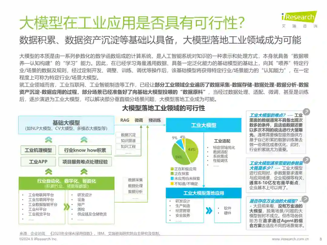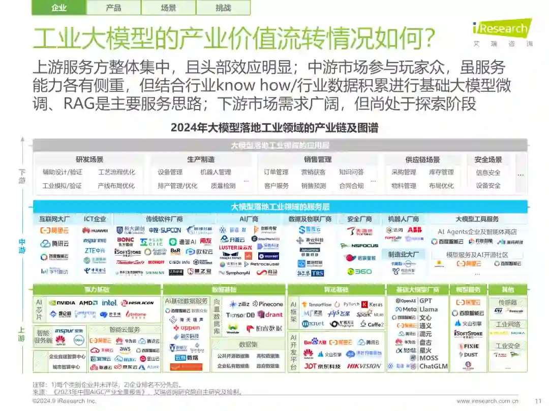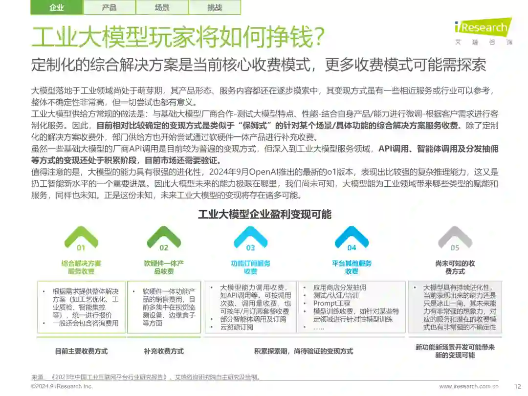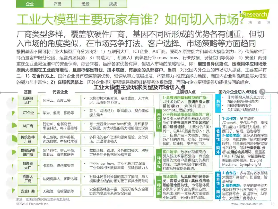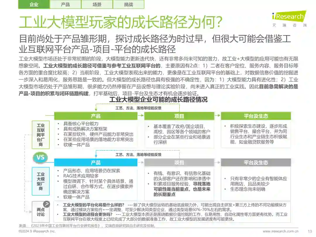 **工业大模型伴随着大模型技术的发展,逐渐渗透至工业,处于萌芽阶段。**就大模型的本质而言,是由一系列参数化的数学函数组成的计算系统,且是一个概率模型,其工作机制是基于概率和统计推动进行的,而非真正的理解和逻辑推理,因此,当前大模型具有不可解释性和幻觉不可消除等主要特征。就大模型落地工业的情况而言,工业互联网、等工作已经让部分工业企业遍历了数据采集-数据存储-数据处理-数据分析-数据资产沉淀-数据应用的过程,部分场景已经准备好了向基础大模型投喂的“数据原料”,当经过简单数据处理、微调、适配后,可以解决部分垂直细分场景问题,具有落地可行性。就工业大模型的发展进度而言,工业大模型与工业互联网一样,都是要挖掘数据资产的价值,而数据准备的阶段性工作在工业互联网时期大部分已经准备好,故我们预计工业大模型的进程在技术不受限的前提下,可能会快于工业互联网。当然,工业大模型是以大模型技术为驱动,其进程快慢很大程度受限于大模型本身能力的进化。 **工业大模型玩家与工业互联网平台玩家重合度高,其成长路径目前也表现出高度相似的特征,但目前市场产品、服务、落地场景都处于探索阶段,大家都在同一起跑线。**就参与玩家而言,大模型技术底蕴、行业know how、运维资源等方面是各类玩家主要锚定的优势,且都是基于自身优势点,围绕具体应用场景摸索大模型在工业的落地性进行市场切入的。就具体产品形态而言,整体还较为稚嫩,目前大模型的能力更多还是依附于已有产品体系,鲜少有独立的产品出现,未来随着大模型流量入口特性明朗,有望独立成产品。就应用场景而言,当前大模型的不可解释性和幻觉等特性,与工业“0容错”的特性相悖,因此当前大模型落地工业的探索更多聚焦于偏运营的、具有一定容错能力的场景(如知识问答、辅助设计/代码生成等),而生产制造等核心场景的探索需要静待模型进化以及CV大模型、多模态大模型的发展。就发展挑战而言,模型、数据、应用、商业变现是无法避开的话题,且各方相互影响,互利共赢。 **大模型落地工业的探索中,还处于非常早期的阶段,供需双方都在尝试,当然,也有很多问题值得探讨与思考。**1)大模型落地工业的竞争要素:基础能力、模型能力、模型应用是主要竞争点,且在不同行业发展阶段,其相对竞争优势有所不同,具体而言:短期主要看大模型技术,长期则主要看模型应用深度。2)大小模型间的关系:大小模型间不存在替代关系,是并存且是协同融合赋能的关系。3)工业大模型服务走向平台化:大模型落地工业的服务平台化特征以开始显现,且逐步形成垂直行业大模型+智能体+小模型+机理模型为主的平台化调用方案。4)产业数据拉通助力工业大模型能力进化的同时,对大模型落地工业的广度、深度都大有裨益。