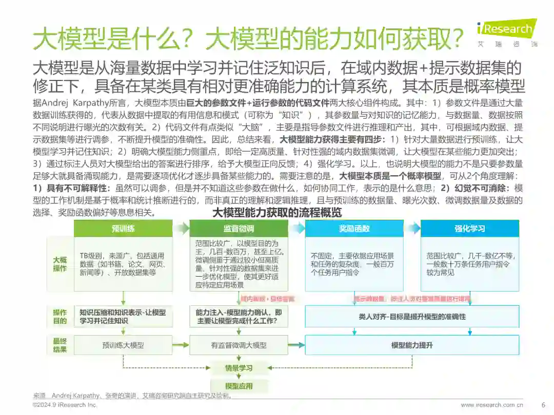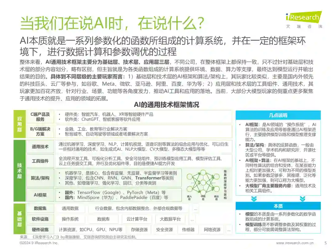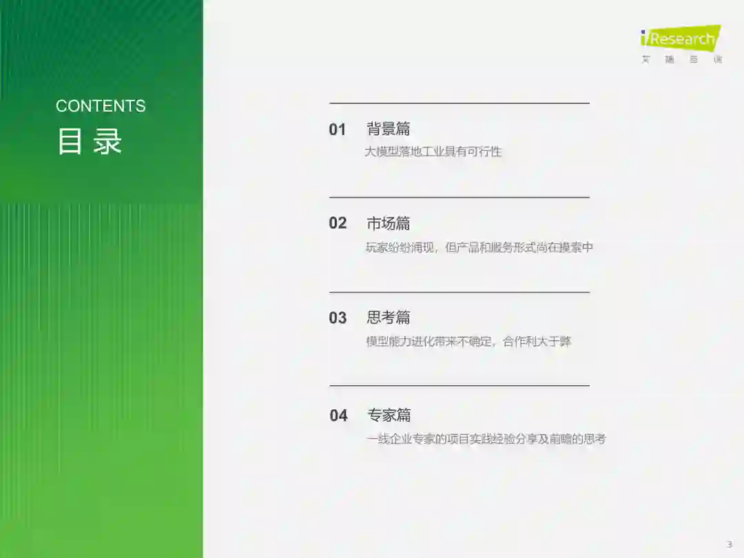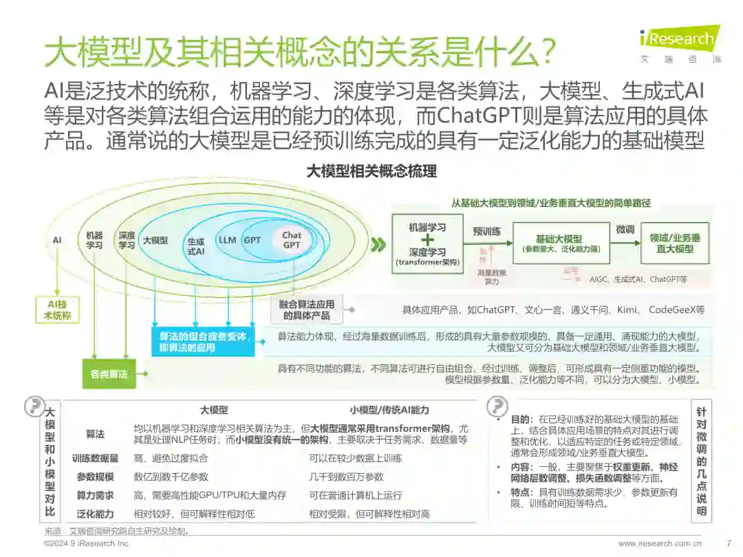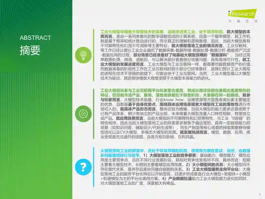 **工业大模型伴随着大模型技术的发展,逐渐渗透至工业,处于萌芽阶段。**就大模型的本质而言,是由一系列参数化的数学函数组成的计算系统,且是一个概率模型,其工作机制是基于概率和统计推动进行的,而非真正的理解和逻辑推理,因此,当前大模型具有不可解释性和幻觉不可消除等主要特征。就大模型落地工业的情况而言,工业互联网、等工作已经让部分工业企业遍历了数据采集-数据存储-数据处理-数据分析-数据资产沉淀-数据应用的过程,部分场景已经准备好了向基础大模型投喂的“数据原料”,当经过简单数据处理、微调、适配后,可以解决部分垂直细分场景问题,具有落地可行性。就工业大模型的发展进度而言,工业大模型与工业互联网一样,都是要挖掘数据资产的价值,而数据准备的阶段性工作在工业互联网时期大部分已经准备好,故我们预计工业大模型的进程在技术不受限的前提下,可能会快于工业互联网。当然,工业大模型是以大模型技术为驱动,其进程快慢很大程度受限于大模型本身能力的进化。 **工业大模型玩家与工业互联网平台玩家重合度高,其成长路径目前也表现出高度相似的特征,但目前市场产品、服务、落地场景都处于探索阶段,大家都在同一起跑线。**就参与玩家而言,大模型技术底蕴、行业know how、运维资源等方面是各类玩家主要锚定的优势,且都是基于自身优势点,围绕具体应用场景摸索大模型在工业的落地性进行市场切入的。就具体产品形态而言,整体还较为稚嫩,目前大模型的能力更多还是依附于已有产品体系,鲜少有独立的产品出现,未来随着大模型流量入口特性明朗,有望独立成产品。就应用场景而言,当前大模型的不可解释性和幻觉等特性,与工业“0容错”的特性相悖,因此当前大模型落地工业的探索更多聚焦于偏运营的、具有一定容错能力的场景(如知识问答、辅助设计/代码生成等),而生产制造等核心场景的探索需要静待模型进化以及CV大模型、多模态大模型的发展。就发展挑战而言,模型、数据、应用、商业变现是无法避开的话题,且各方相互影响,互利共赢。 **大模型落地工业的探索中,还处于非常早期的阶段,供需双方都在尝试,当然,也有很多问题值得探讨与思考。**1)大模型落地工业的竞争要素:基础能力、模型能力、模型应用是主要竞争点,且在不同行业发展阶段,其相对竞争优势有所不同,具体而言:短期主要看大模型技术,长期则主要看模型应用深度。2)大小模型间的关系:大小模型间不存在替代关系,是并存且是协同融合赋能的关系。3)工业大模型服务走向平台化:大模型落地工业的服务平台化特征以开始显现,且逐步形成垂直行业大模型+智能体+小模型+机理模型为主的平台化调用方案。4)产业数据拉通助力工业大模型能力进化的同时,对大模型落地工业的广度、深度都大有裨益。