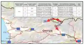 图1中显示的战斗力范围可以告知所需的战斗力,这些战斗力来自于格鲁吉亚部队的位置,用蓝色矩形标注,以便在各种可能的情况下击败这支俄罗斯部队。图1中描述的两种情况是俄罗斯使用西面的马米森山口或东面的罗基隧道(带箭头的红线)。