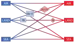 到目前为止,修改后的方法已经建立了一种发展 "下一步行动 "的方法,其基础是对友军和敌军战斗力的理解,这种战斗力如何受到任务类型和地形的影响,以及部队在移动和机动接触中的时间关系。地面部队的这些例子必须自然延伸到所有领域的战斗力和效果的应用。这种技术能够同时分析各个领域,并为跨领域效果的整合提供一个机制。近距离空中支援的架次可以被整合到地面领域,以便在地面战斗的关键地点和时间提供更好的战斗力比率。此外,在进行空对空作战计算时,可以将地面防空资产纳入空对空计算的因素。图4显示了通过罗基隧道进攻的俄罗斯地面部队和推荐的格鲁吉亚地面部队的战斗力,另外还强调了如何将俄罗斯的苏-25战斗机或格鲁吉亚的SA-11系统纳入其中。这为在领域内和跨领域进行的作战行动创建了一个多维框架,并提供了一种同步汇合的方法。当一个领域的条件发生变化时,对其他领域和行动的影响可以在开始大大超过工作人员计算的复杂程度上进行。