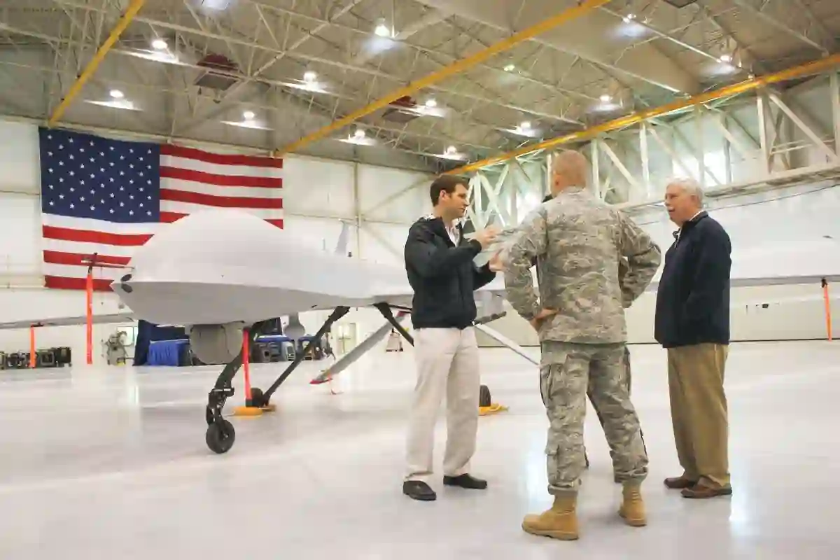 (图:作家兼战略家彼得辛格(左)于 2018 年 11 月 1 日在一个未命名的空军设施与一名军官和一名国防部文职人员讨论新技术。人工智能和脑机接口等进步将改变陆军作战的方式。)