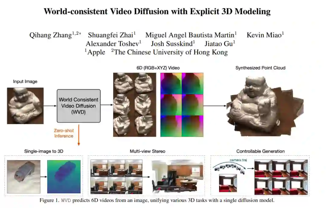 近期在扩散模型方面的进展设立了图像和视频生成的新基准,能够在单帧和多帧上下文中实现逼真的视觉合成。然而,这些模型仍然在高效且显式地生成3D一致性内容方面存在困难。为了解决这个问题,我们提出了世界一致性视频扩散(WVD)框架,这是一种新颖的框架,采用显式的3D监督,使用XYZ图像编码每个图像像素的全局3D坐标。 具体而言,我们训练了一种扩散变换器,来学习RGB和XYZ帧的联合分布。这种方法通过灵活的图像修复策略支持多任务适应性。例如,WVD可以从真实的RGB图像中估计XYZ帧,或者使用沿指定相机轨迹的XYZ投影生成新的RGB图像。通过这种方式,WVD统一了单图像到3D生成、多视角立体和相机控制的视频生成等任务。我们的方法在多个基准测试中表现出竞争力,提供了一个可扩展的解决方案,用于通过单一预训练模型生成3D一致性的视频和图像。我们的项目网站是 https://zqh0253.github.io/wvd。