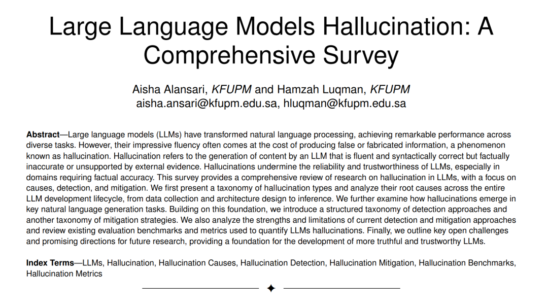 摘要——大型语言模型(Large Language Models, LLMs)已经彻底变革了自然语言处理领域,在多种任务上取得了显著性能。然而,这种令人印象深刻的流畅性往往以生成虚假或捏造的信息为代价,这一现象被称为幻觉(hallucination)。所谓幻觉,是指LLM生成的内容虽然流畅且语法正确,但在事实层面上不准确或缺乏外部证据支撑。幻觉削弱了LLM的可靠性与可信度,尤其在那些对事实准确性要求较高的应用领域中影响尤为严重。 本综述系统梳理了LLM幻觉相关研究,重点关注其成因、检测与缓解。我们首先提出了幻觉类型的分类体系,并从数据收集、模型架构设计到推理阶段,分析了幻觉在LLM全生命周期中的根本成因。接着,我们探讨了幻觉在关键自然语言生成任务中的表现机制。在此基础上,我们分别构建了幻觉检测方法幻觉缓解策略的系统分类框架,并分析了现有方法的优势与局限。同时,我们回顾了用于量化LLM幻觉的评测基准与指标体系。最后,我们总结了当前研究的主要挑战,并展望了未来可能的研究方向,为构建更加真实、可信的大语言模型提供理论与方法基础。 关键词——大语言模型;幻觉;幻觉成因;幻觉检测;幻觉缓解;幻觉基准;幻觉指标