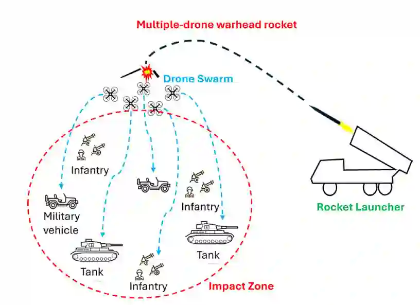 本文提出了一种新颖的军事目标探测与压制方法,该方法利用配备智能集束弹药的火箭发射的仿生无人机集群。尽管集束弹药的使用因对平民构成残余风险而面临国际限制,但仿生集群策略为复杂作战环境中更有效、更安全的军事侦察与交战行动提供了一条前景广阔的路径。本研究借鉴集群机器人技术、人工智能及仿生算法的最新进展,探索了火箭发射的智能弹药引爆后部署多架无人机的能力,使其能够追踪并识别地面目标。该方法通过结合CACOC(覆盖性混沌蚁群优化)机动模型与新型加权目标逼近(WTA)策略的二维仿真得以实现。捕食者遵循不可预测的轨迹同时沉积虚拟信息素痕迹以避免重复覆盖,而WTA则协调捕获意图并优先处理高价值目标。在此设定下,智能体被建模为受分布式控制规则支配的传感单元,从而实现广域覆盖与自适应探测精度。此外,自主飞行器与对抗智能体的参数均采用协同进化算法进行优化,确保持续适应性与性能提升。研究采用克鲁斯卡尔-沃利斯检验与邓恩-博法罗尼检验进行结果验证。在无WTA场景下,步兵、车辆与坦克捕获量的所有两两比较均具有统计学显著性(p < 0.01)。在WTA策略下,步兵对车辆与步兵对坦克的差异仍高度显著(p < 10^−15),但车辆与坦克的捕获量无显著差异(p = 1.000)。这证实了通信机制将捕食者焦点转向高价值目标,而非均匀改变所有捕获行为。基于CACOC-WTA的方法表明,智能弹药在50代评估中成功实现了对地面目标的压制。