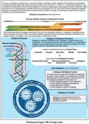 FM 2-0 逻辑图如下。它说明了与多域作战情报支持相关的 "为什么"、"谁"、"做什么"、"在哪里 "和 "如何做 "等首要问题。本出版物的每一章都建立在前几章的基础之上。FM 2-0 讨论了情报支持的许多方面,包括指挥官和参谋人员在情报工作中的作用、情报参谋人员的活动以及军情单位如何开展情报行动作为信息收集的一部分。最后两章讨论了一个关键主题:为情报而战--就不合作和已确定的威胁提供情报的斗争。