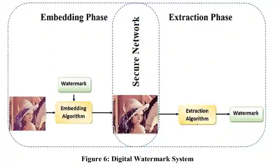 图像处理技术的发展使复制、改变和分享数字内容变得更容易,而且成本低,同时保持高质量。数字照片的水印是检测篡改和证明所有权的另一种方法[60]。如图6所示,水印是在图像中插入一段信息而不改变其价值的一种手段,以便识别数据的原始来源。