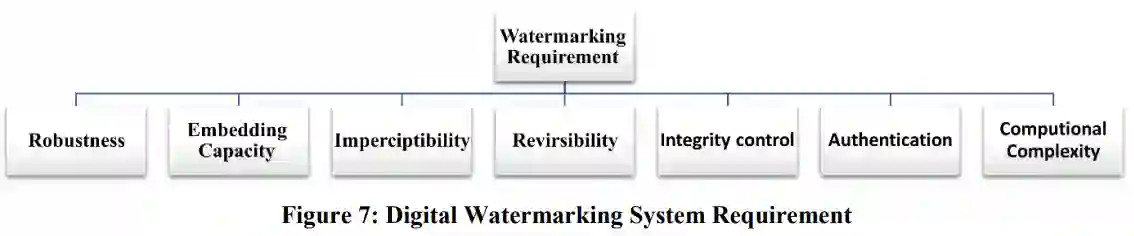 水印法克服了密码学的局限性,将水印放入封面图像中,从而防止水印被发现[61]。图7中描述了水印方法的多种要求。