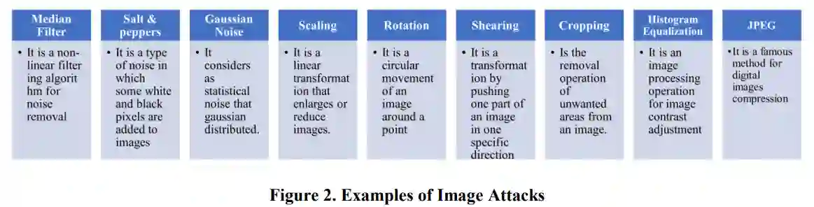 如图2所示,在图像通过多媒体网络传输时,许多类型的攻击会对其产生影响。这些攻击被归类为噪音攻击(盐和胡椒,高斯噪音),几何攻击(翻译,缩放和旋转),以及其他[3]。另一方面,图像去噪如平均滤波器、中值滤波器和索贝尔滤波器。直方图均衡化和自适应直方图是图像处理攻击的一个例子。此外,图像压缩攻击。