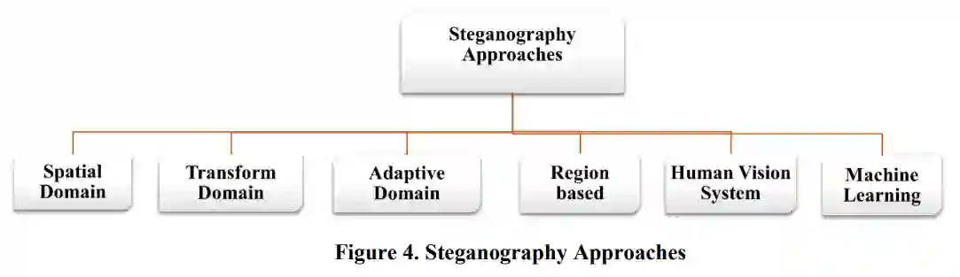 如图4所示,各种隐写方法可以分为空间、变换、自适应域、基于区域、人类视觉和机器学习。这种分类将在接下来的章节中更深入地描述,同时也会介绍一些最新的研究[9]。