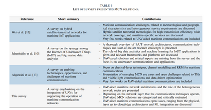 表一总结了海事通信和海事物联网领域调查的贡献,并强调了它们对无人机集成问题的重视。从Wei等人[15]的综述开始,作者将重点放在了支持海上物联网需求的混合卫星网络架构上。详细讨论了与环境和地理特征相关的海上通信挑战,并根据其目标,即提高传输效率、确保广泛覆盖和保证海上服务QoS,对最新的解决方案进行了分类。然而,这项综述只包括非常少的无人机辅助海上通信研究。然后,Jahanbakht等人的调研。[10]提供了IoUT综合和大海洋数据分析的全面概述和教程。介绍了几种IoUT体系结构,并详细介绍了IoUT与机器学习辅助优化之间的相互作用。然而,这一调研与本文中提出的有很大的不同,因为在无人机辅助海上网络中完全没有最先进的技术。Alqurashi等人最近的另一项调研概述了海上通信问题,并着重于物理层方面、信道模型和辐射资源管理(RRM)算法的当前发展。此外,还讨论了有趣的海事用例,突出了该领域的研究潜力。尽管如此,基于无人机的解决方案并没有在调研中进行讨论,因此留下了文献中的空白,本工作旨在填补这一空白。