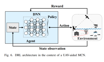 当前MCNs的一个固有特性是由于有限的覆盖而产生的间歇性连接。海事服务将面向船舶、设备和无人船的自主运行,实时数据处理至关重要。无人机辅助的MEC可以缓解这个问题,因为数据将在本地处理,从而避免过度使用回程链路[144]。无人机(uav)、USVs (usv)和uuv (uuv)的深度融合可以实现最优的计算任务分配和实时的数据收集,从而最小化网络延迟。高效的边缘计算和缓存算法应将处理能力与无人驾驶车辆的轨迹及其能量约束结合起来考虑,以保持无人机在网络中的高可用性[145],[146]。