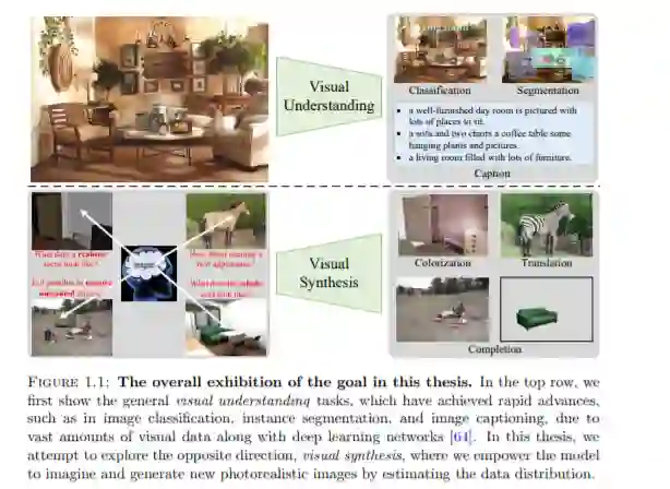 本文的目的是展示在解决各种视觉合成和生成任务方面的研究贡献,包括图像翻译、图像补全和已完成的场景分解。本论文共五篇论文,每一篇论文都提出了一种新的基于学习的方法来合成内容可信且外观逼真的图像。每一项工作都证明了所提出的方法在图像合成方面的优越性,并对其他任务如深度估计做出了进一步的贡献。